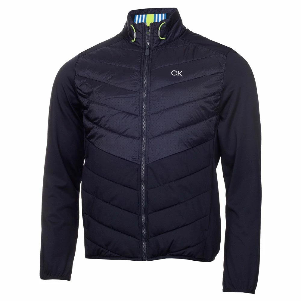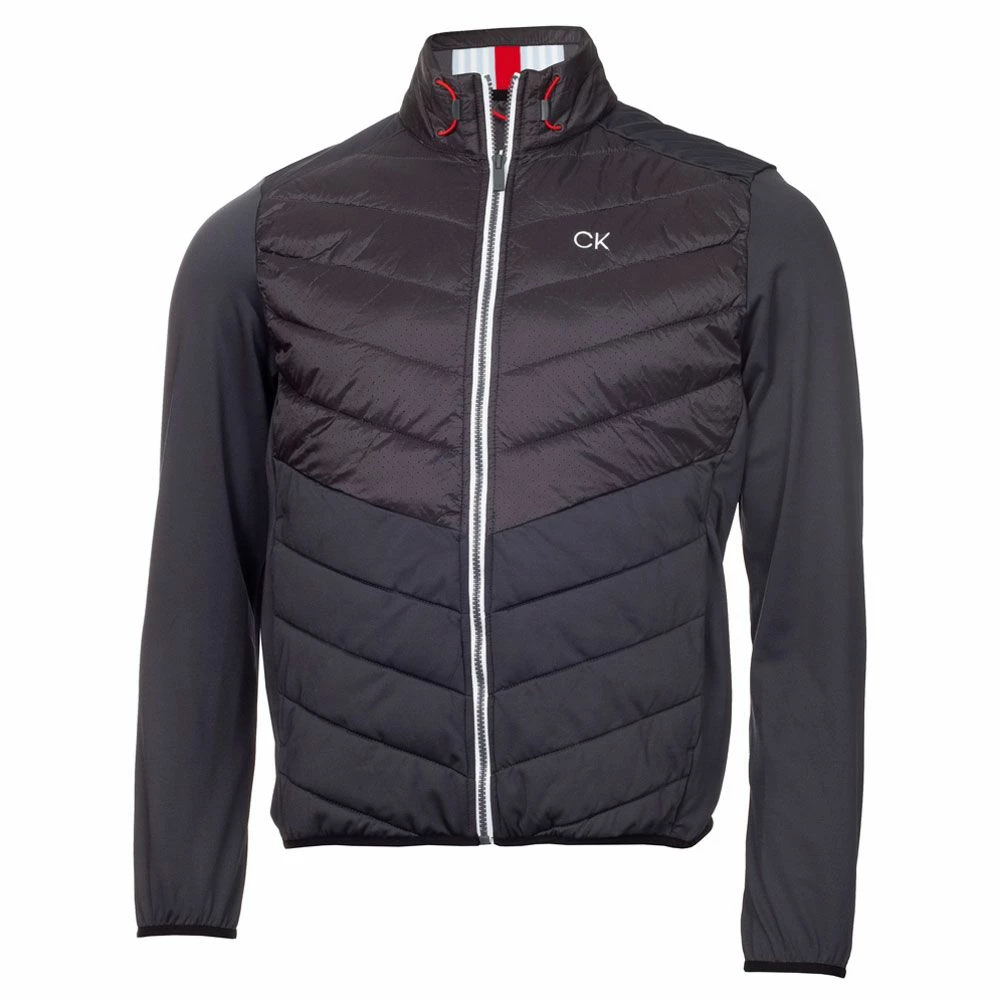 Don’t let the weather keep you from the course this season – the Calvin Klein 17 Mile Drive Hybrid Golf Jacket offers excellent protection from the wind and cold with its innovative mix of two fabrics – super soft and high stretch back, sleeves and sides with a padded nylon front and collar. Two front zippered pockets ensure secure storage. A drawstring cord at the collar and soft, stretch fabric hem and cuffs provides a better fit and extra protection from the elements. Calvin Klein branded zip pulls and a ‘CK’ logo embroidered on the left chest finish off the look nicely.