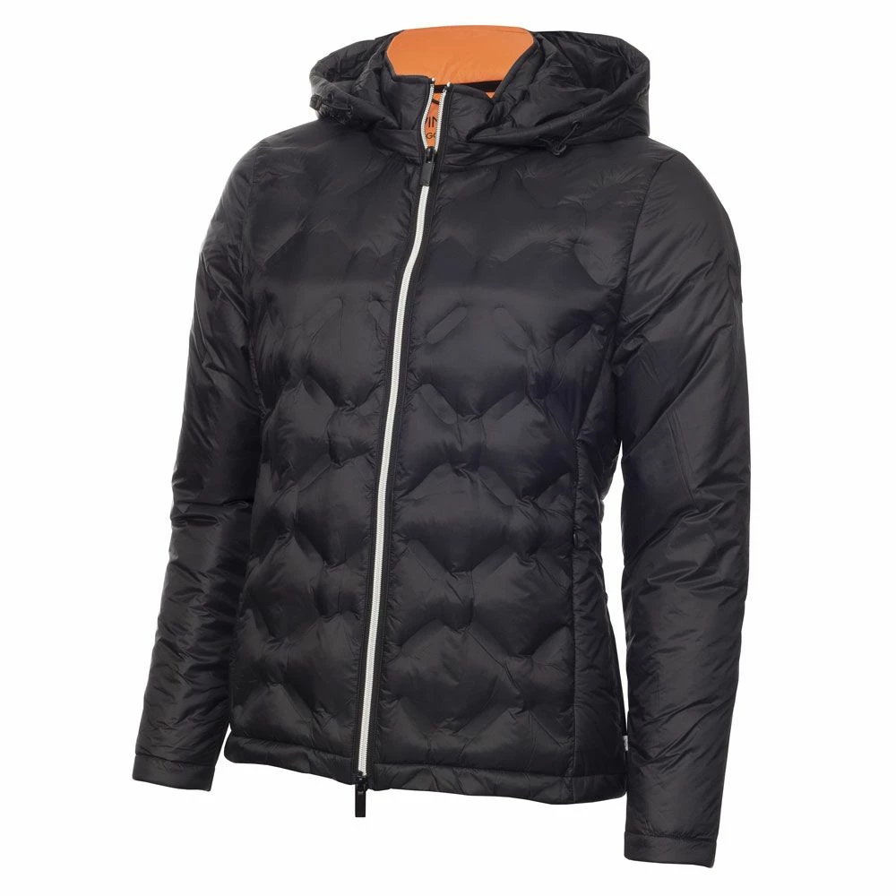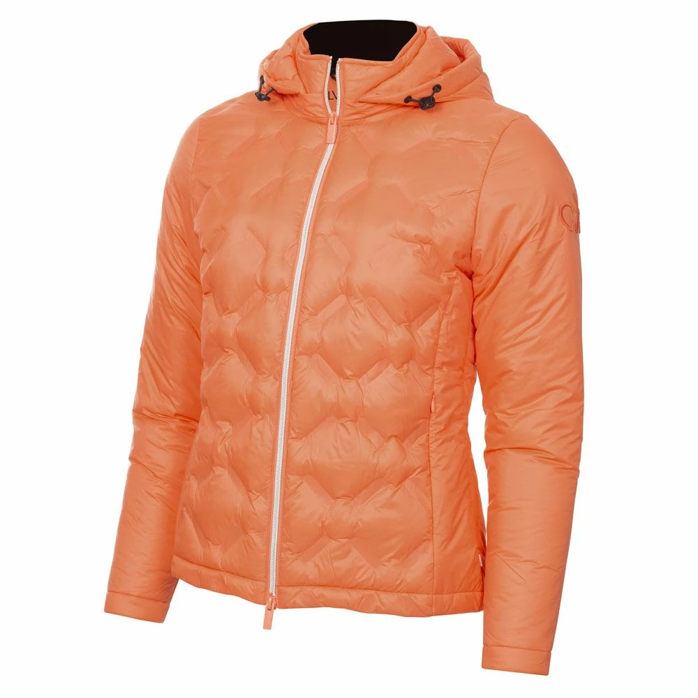The Calvin Klein Ladies Aster Padded Golf Jacket features an attractive diagonal tech quilting pattern with a high collar for extra cosiness. The padded hood is fully detachable for a versatile look. Chill Force 3 Technology lightweight padding provides exceptional protection from the wind and is finished with DWR – a Durable Water Repellent surface. There are two side pockets with concealed zips and the two-way front zip is a handy feature. Finished with an oversized raised embroidered Calvin Klein logo on the left sleeve and a ‘ck’ signature woven tab stitched into the left side seam, the Calvin Klein Ladies Aster Padded Golf Jacket is perfect for the winter months.