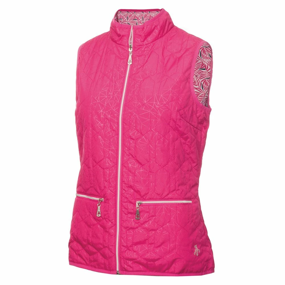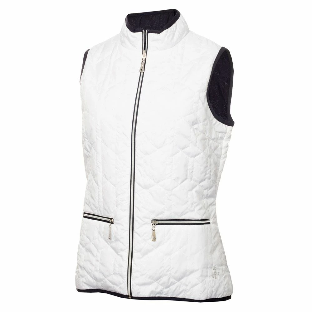 For two great looks in one add a super stylish yet practical warming layer with the Green Lamb Kelly Reversible Ladies Golf Gilet. One side is a solid colour and boasts a beautiful, quilted pattern with silver exposed zips at the pockets. However, if you’re feeling adventurous check out the vibrant print on the reverse (except for navy/white colourway). Lightly padded it features a water-resistant finish to keep you playing in comfort. There are two front pockets on both sides and elastic binding at the hem, collar, and armholes gives a better fit. A two-way exposed silver zip with Green Lamb Swarovski crystal zip pull and a silver Lamb logo to the front left above the hem completes the look.