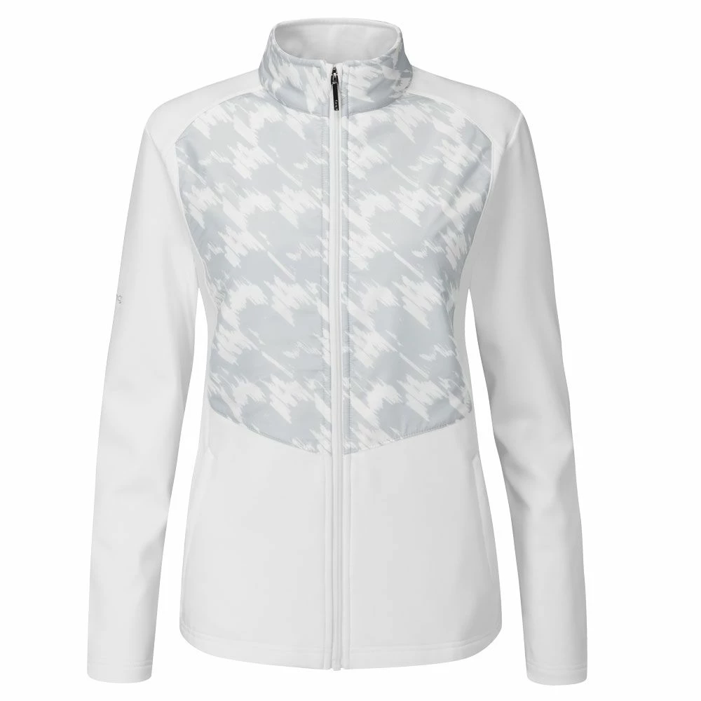 The Ping Ladies Prue Golf Jacket is a printed hybrid jacket, engineered for warmth in cold weather and resistance from wind and rain. A wind and water-resistant outer will keep you protected from the elements whilst SensorWarm® technology traps warm air and resists wind-chill, keeping you warm with minimal weight. The fabric also has an element of stretch, allowing you to move freely through your game. Styled with a graphic print on the upper back and chest and two front pockets, the Prue Jacket is perfect for those cooler days on the course.