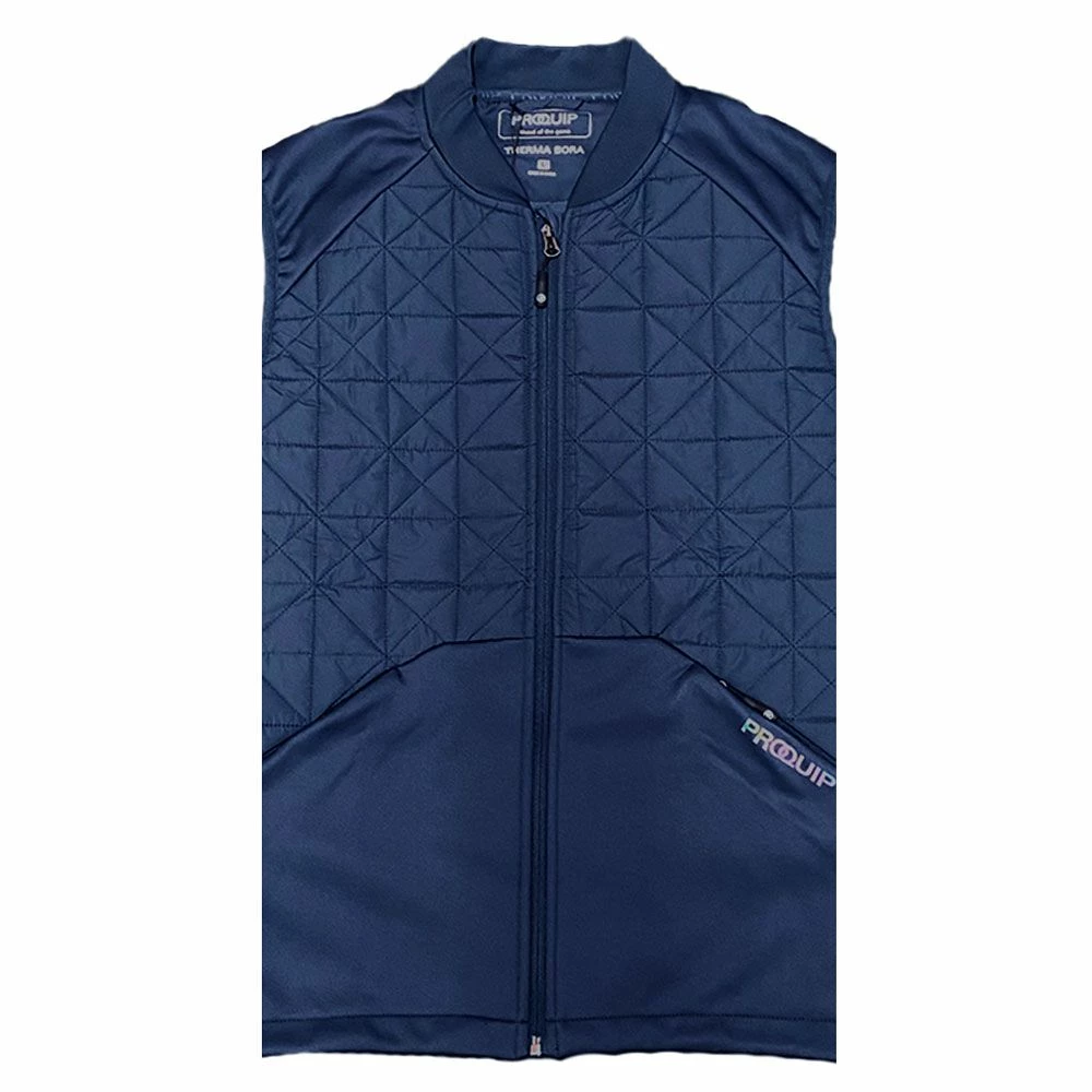 The ProQuip Therma Bora Golf Gilet is a thermal windproof with a hybrid quilt design. Made from a Polyester soft shell fabric it has a durable water repellent finish for protection against wind and rain. The ultra-light polyester quilt padding provides warmth and heat retention and an adjustable cord at the hem provides added protection from the cold. A soft stretch collar provides a better fit and there are two zippered front pockets for essential items. Reflective print ProQuip branding completes the look.