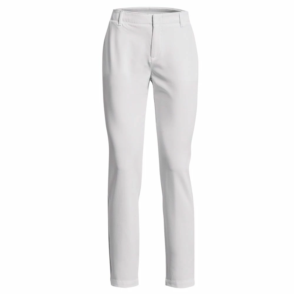 The Under Armour Links Ladies Golf Pants are flexible and lightweight, made to stretch with every swing to keep you comfortable and performing your best. A stretch-engineered waistband with adjustable inner elastic provides the perfect fit and the tapered fit leg gives a modern, streamlined look. There are 4 pockets and a metal look Under Armour logo above the back right pocket completes the look.
